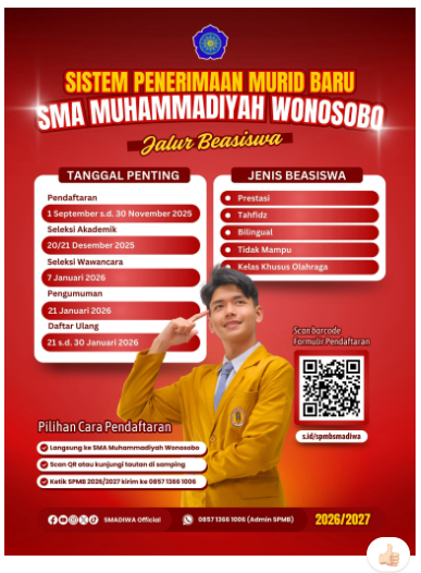 <p>🚀 Mimpi besar butuh langkah berani!<br>Kini saatnya wujudkan masa depanmu bersama SMA Muhammadiyah Wonosobo melalui Jalur Beasiswa 2026/2027!</p><p>📝 Tanggal Penting<br>Pendaftaran: 1 Sept–30 Nov 2025<br>Seleksi Akademik: 20/21 Des 2025<br>Seleksi Wawancara: 7 Jan 2026<br>Pengumuman: 21 Jan 2026<br>Daftar Ulang: 21–30 Jan 2026</p><p>🎓 Jenis Beasiswa<br>✅ Prestasi<br>✅ Tahfidz<br>✅ Bilingual<br>✅ Tidak Mampu<br>✅ Kelas Khusus Olahraga</p><p>📲 Pilihan Cara Pendaftaran<br>1. Datang langsung ke SMA Muhammadiyah Wonosobo<br>2. Scan QR pada brosur / link 👉 s.id/spmbsmadiwa<br>3. Ketik: SMPB 2026/2027 lalu kirim ke 0857 1366 1006</p><p>ℹ️ Info lebih lanjut: 0857 1366 1006 (Admin SPMB)</p><p>🌟 Bersama SMA Muhammadiyah Wonosobo, kita tidak hanya belajar, tapi juga tumbuh menjadi generasi berkarakter, berilmu, dan siap menyongsong masa depan!</p><p>👉 Daftar sekarang dan raih masa depan terbaikmu!</p>